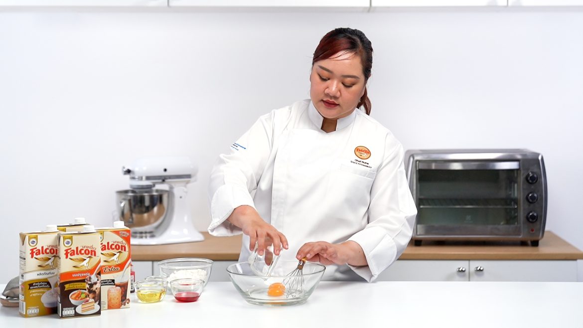 4. ผสมไข่แดงกับน้ำแดงกลิ่นสละให้เข้ากัน ใส่น้ำมันพืชลงไป ตามด้วยนมข้นจืด นกเหยี่ยว ฟอลคอน จากนั้นผสมให้เข้ากัน