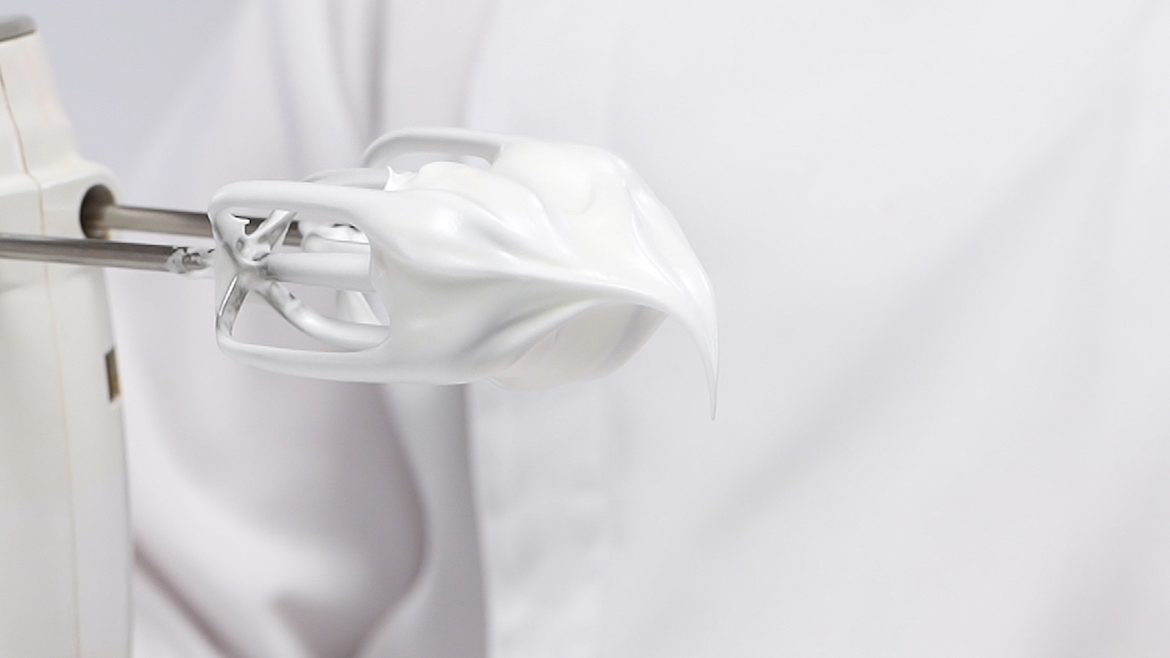 6. ตีเมอแรงค์โดยใส่ครีมออฟทาร์ทาร์ลงในไข่ขาวตีจนเป็นฟองหยาบ ๆ ค่อย ๆ ทยอยใส่น้ำตาลทรายลงไปจนหมด ตีจนตั้งยอดปานกลาง