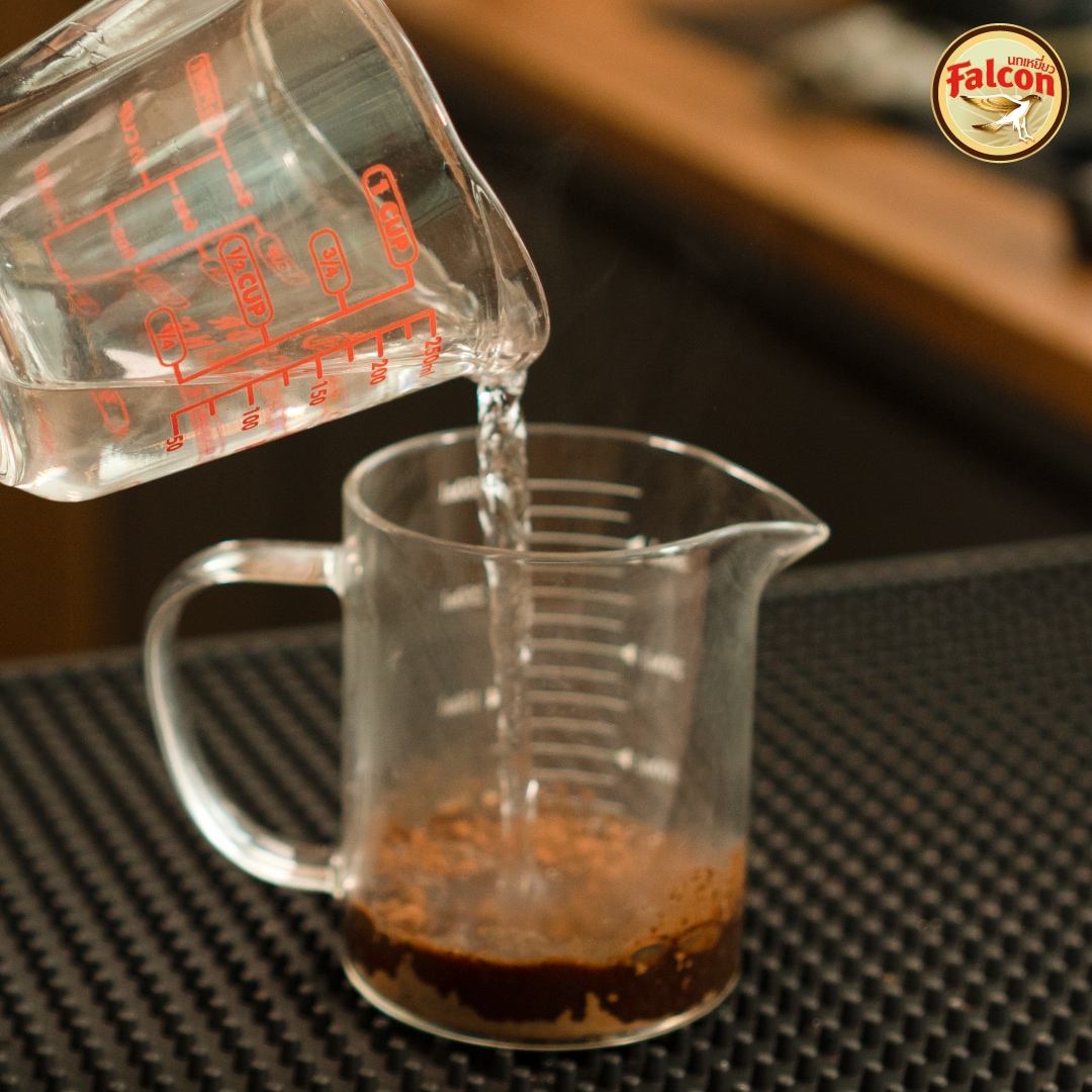 เตรียมทำฟองนม โดยเทนมตีฟองและผสมเครื่องดื่ม ตรานกเหยี่ยว