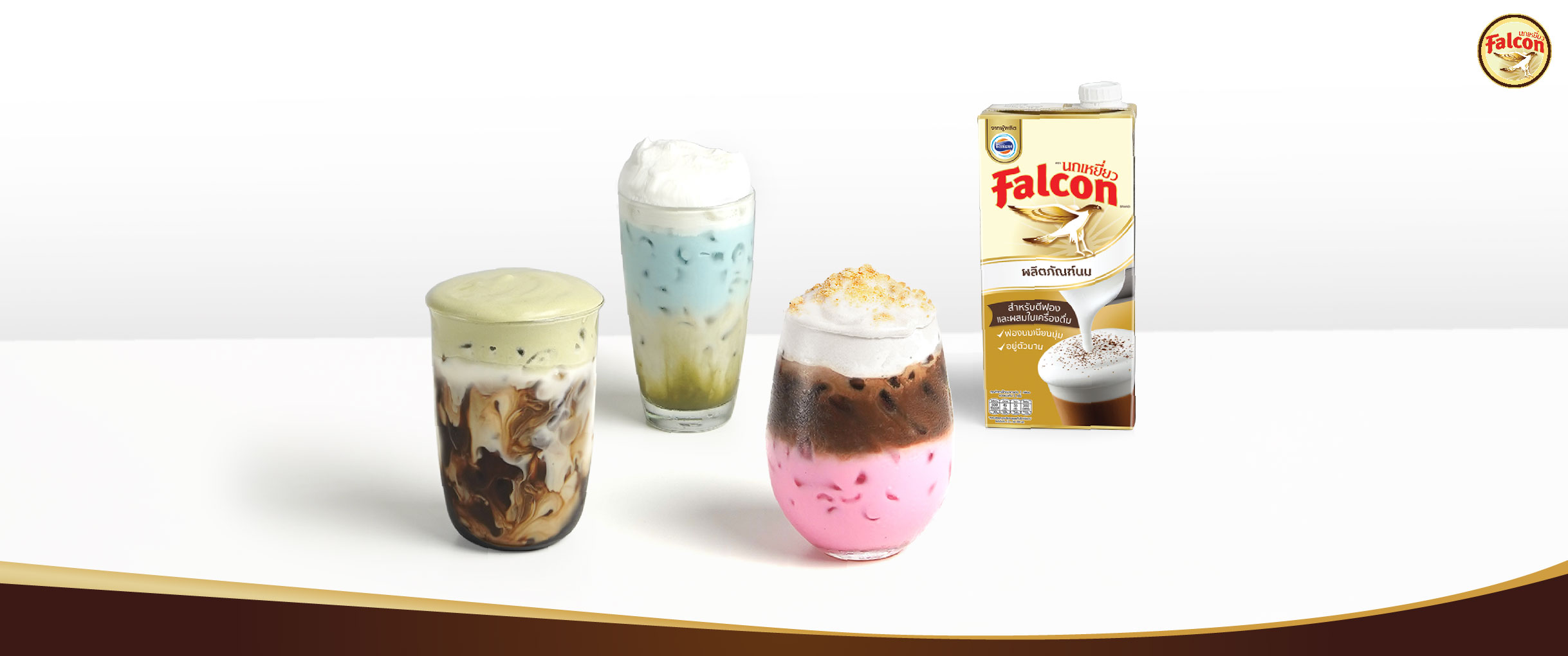 2. จากนั้นมาทำในส่วนของฟองนม โดยใช้ผลิตภัณฑ์นมตีฟองและผสมในเครื่องดื่ม นกเหยี่ยว ฟอลคอน แช่เย็นและเทลงในพิชเชอร์เย็นจัด จากนั้นตีฟองให้เข้ากันได้เลย