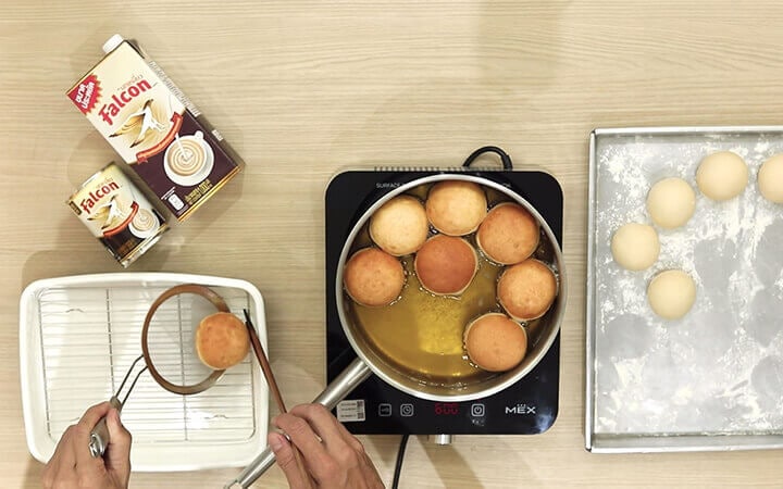 4. ตั้งน้ำมันสำหรับทอดที่ 150 องศาเซลเซียส ใส่โดนัทลงไป พอแป้งสุกและสีสวย ก็พลิกกลับด้าน ทอดประมาณด้านละ 1 ½ นาที ตักออกจากน้ำมัน และพักไว้บนถาด