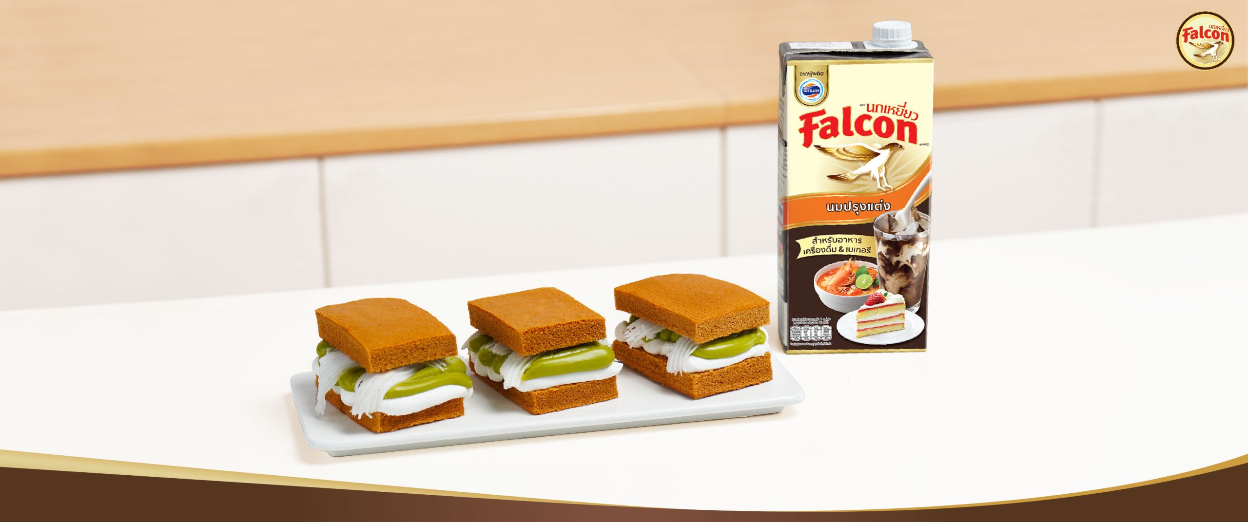 2. ละลายเนยสดเค็ม ผงชาไทย เข้าด้วยกัน จากนั้นผสม นมข้นจืด ตรานกเหยี่ยว ฟอลคอนลงไป พักไว้ เมื่อตีเนื้อเค้กครบเวลาแล้วจึงค่อยๆ เทส่วนผสมของเหลวที่ได้ผสมไว้ลงไป ตีให้เข้ากัน