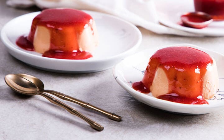 5. เมื่อต้องการรับประทาน ให้นำพิมพ์แพนนาคอตต้าจุ่มลงในน้ำร้อนให้พออุ่น นำออกจากพิมพ์แล้วราดด้วยซอสสตรอว์เบอร์รี่ พร้อมเสิร์ฟทานได้ทันที