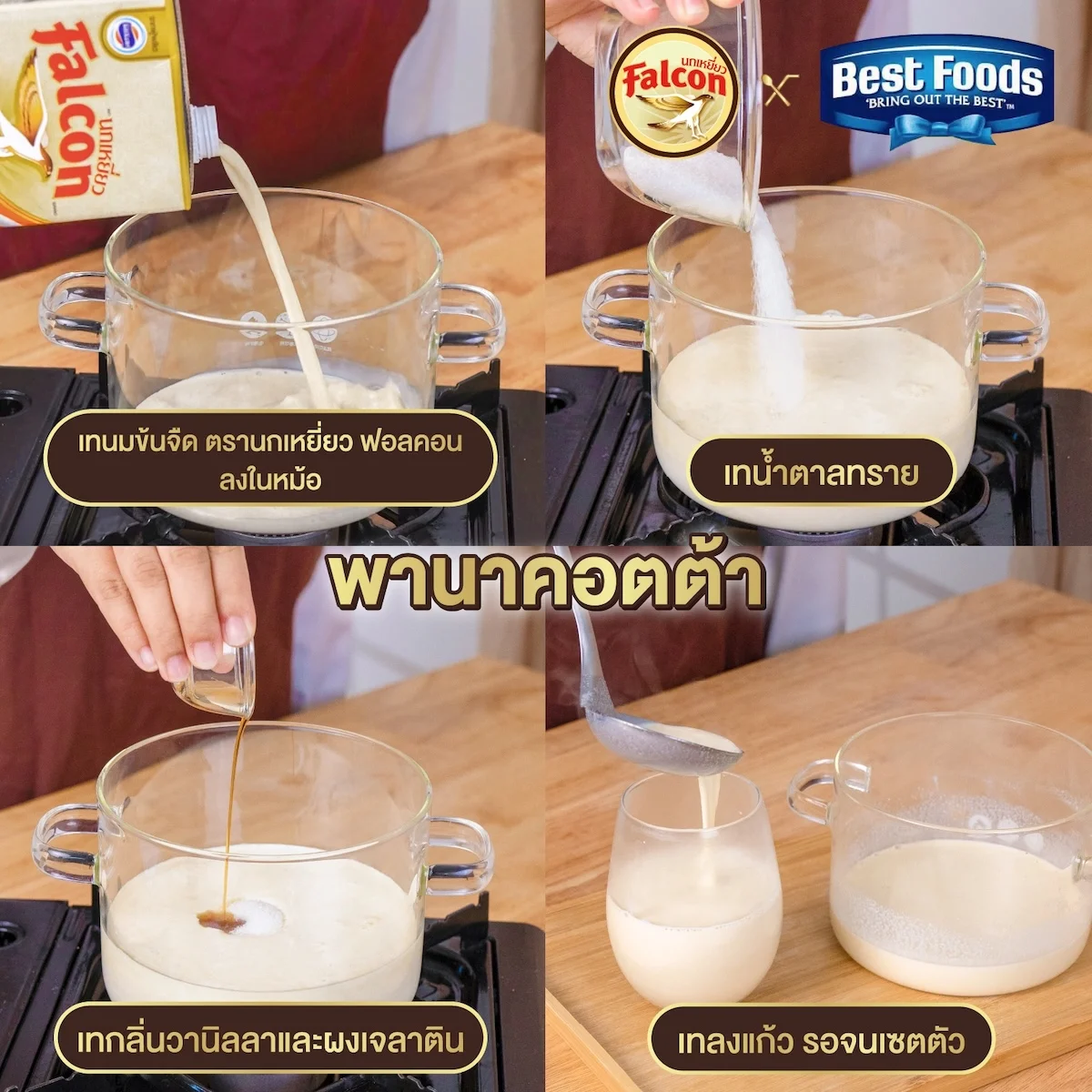 2. นำนมสด และนมข้นจืด ตรานกเหยี่ยว ฟอลคอน ใส่ในหม้อ เปิดไฟกลาง จนร้อน