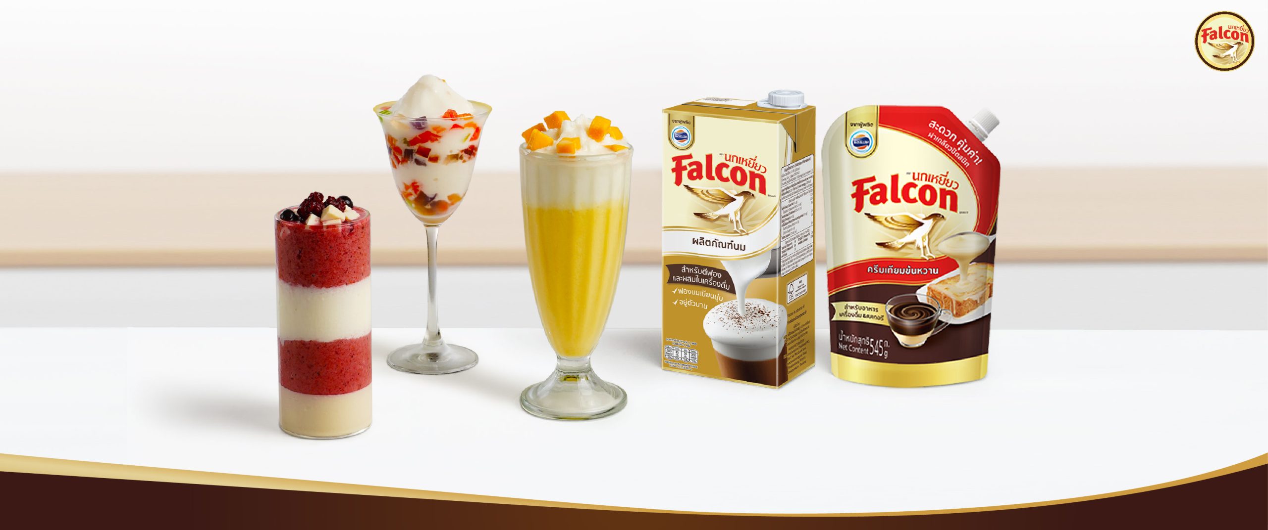 - ผสมนมผสมตามสูตร 2:2:1 ข้นจืด นกเหยี่ยวฟอลคอน เอ็กซ์ตร้า ผสมกับผลิตภัณฑ์นมสำหรับตีฟองและผสมในเครื่องดื่ม นกเหยี่ยวฟอลคอน และข้นหวาน ฟอลคอนถุงบีบ