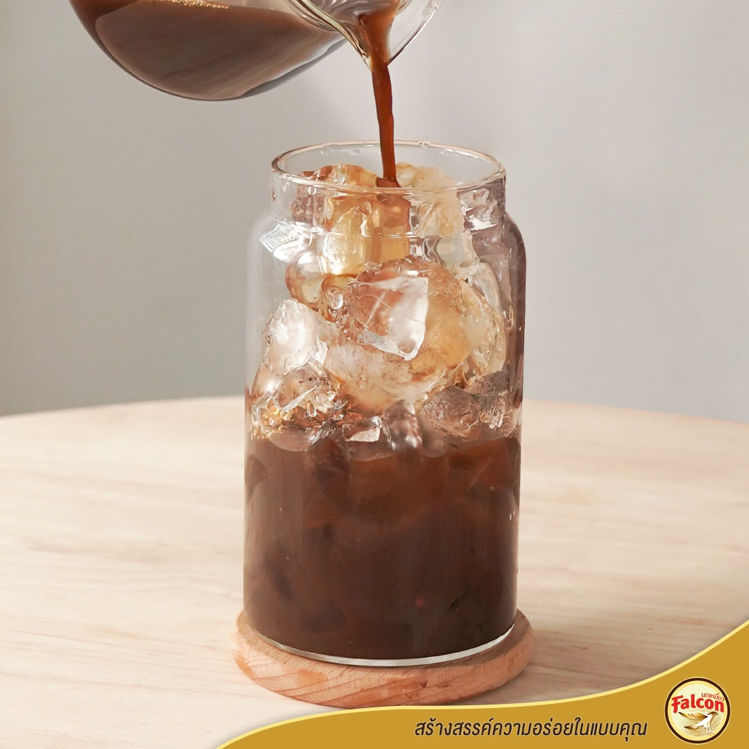 4. เทกาแฟเข้มข้น แล้วตามด้วยนมลงในแก้วที่มีน้ำแข็ง
