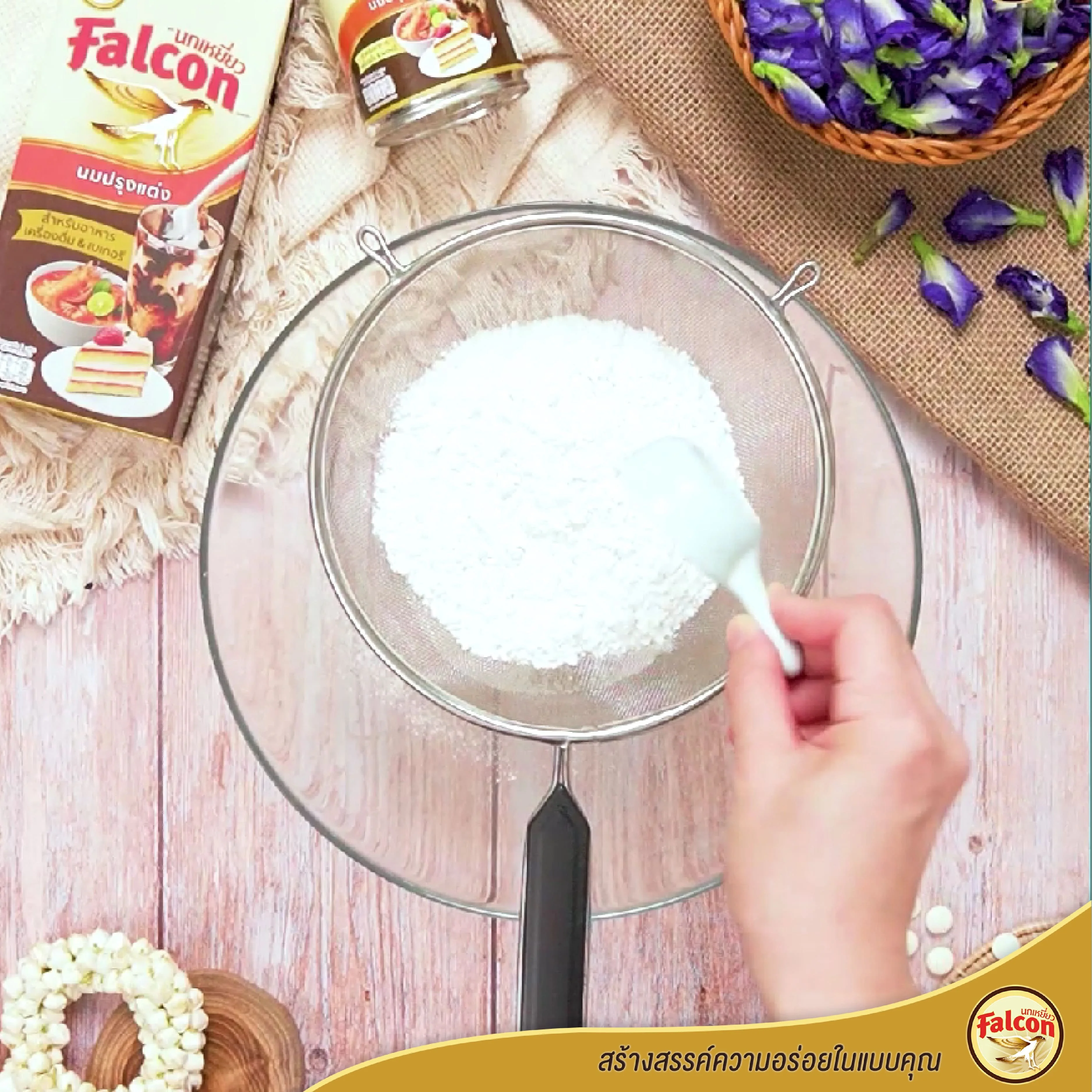และใช้ตะกร้อมือคนส่วนผสมทั้งหมดให้เข้ากัน