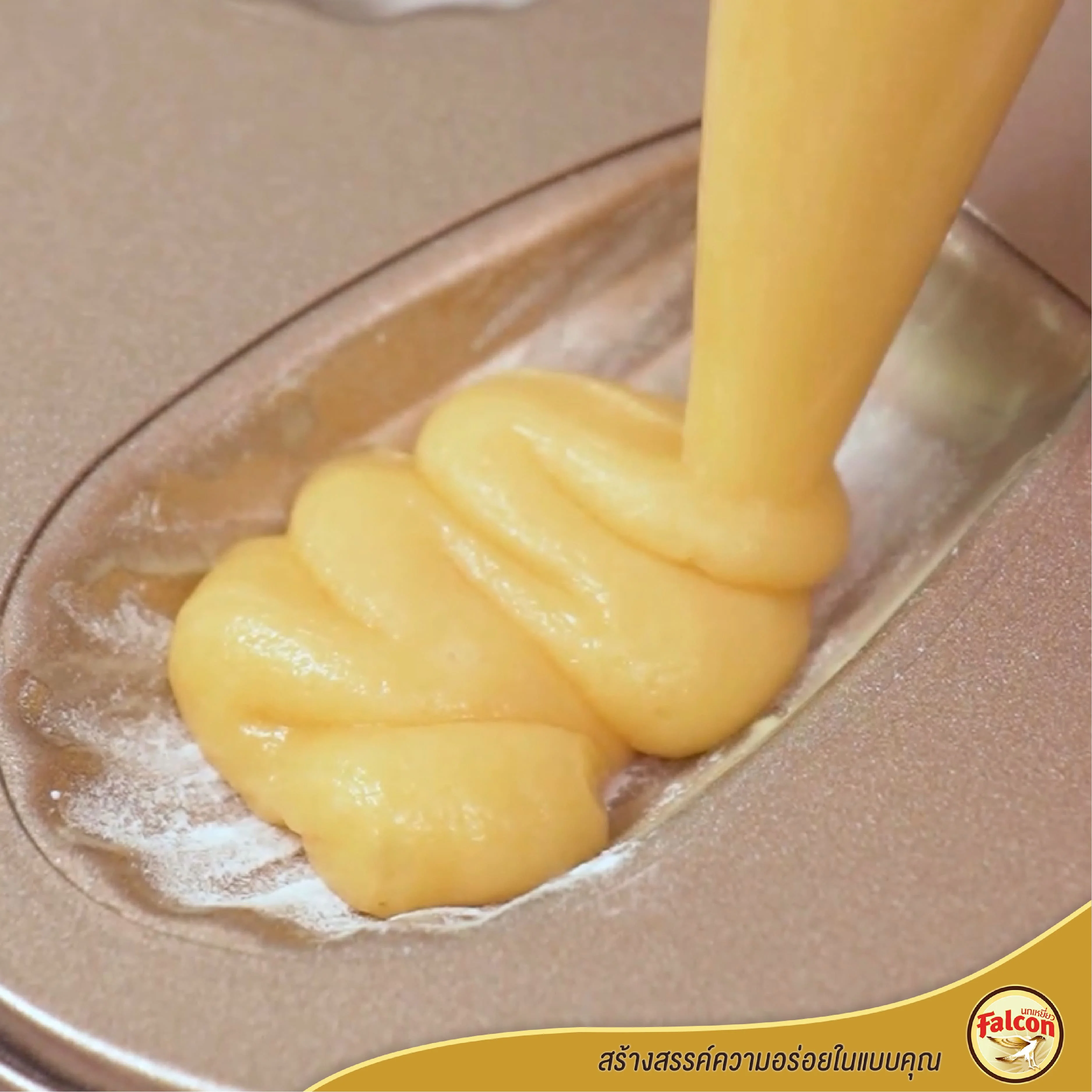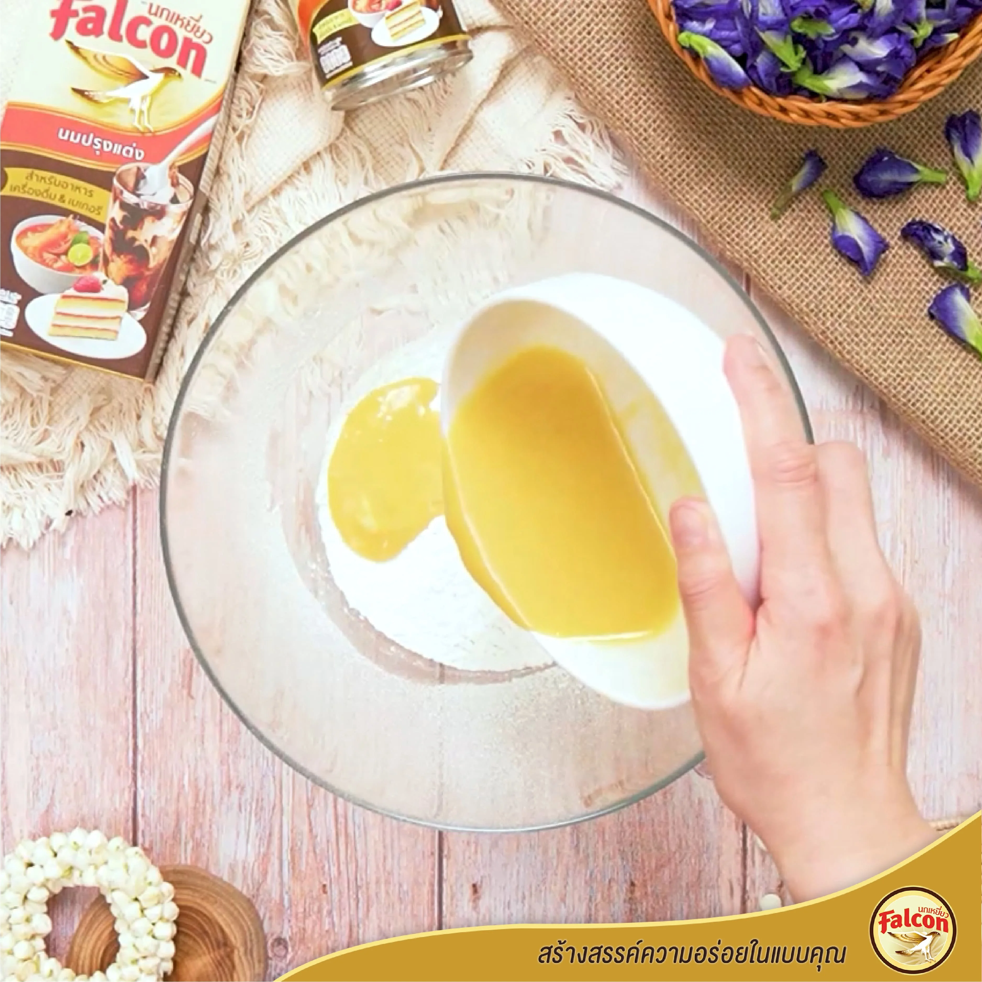 5. เทส่วนผสมทั้งหมดลงในชามผสมของแป้ง
