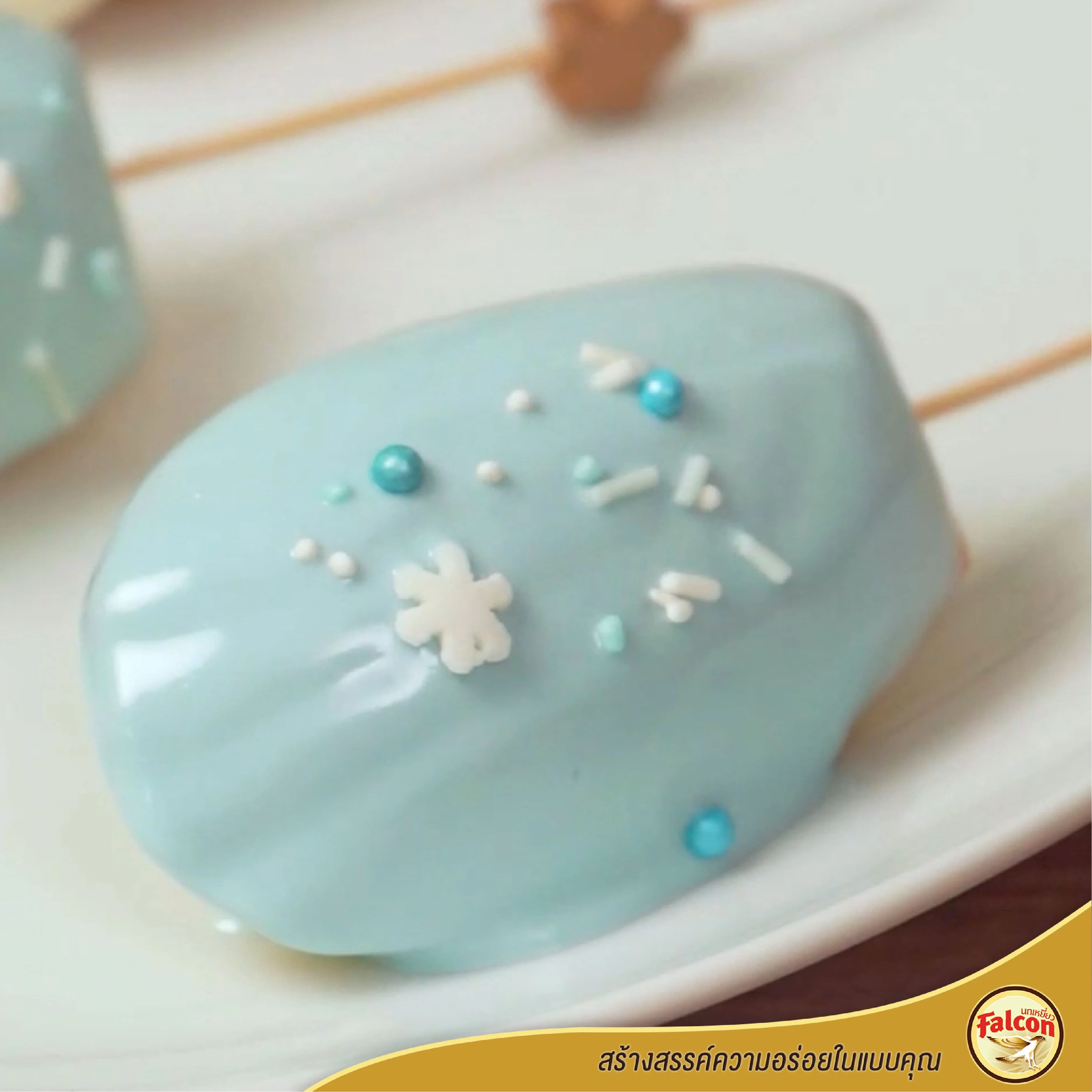 สลับทั้งสีฟ้าและขาว โรยหน้าด้วยเกล็ดน้ำตาล